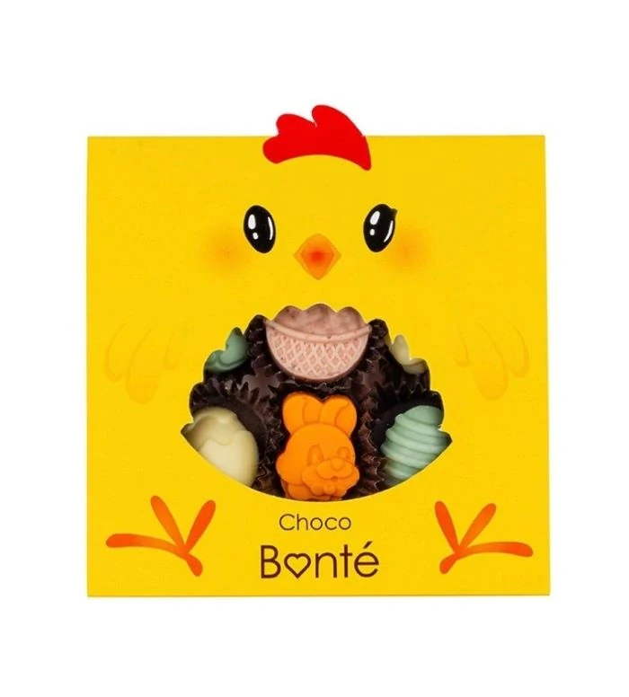 Skvelý darček, veľkonočné dekorácie alebo sladké pokušenie! Naša roztomilá veľkonočná bonboniéra ukrýva 6 lahodných praliniek z bielej čokolády vo sviežich ovocných príchutiach. Hravá veľkonočná výslužka, ktorá v sebe skrýva farebné cukríky jedinečných veľkonočných tvarov, ktoré rozžiaria vašu Veľkú noc!