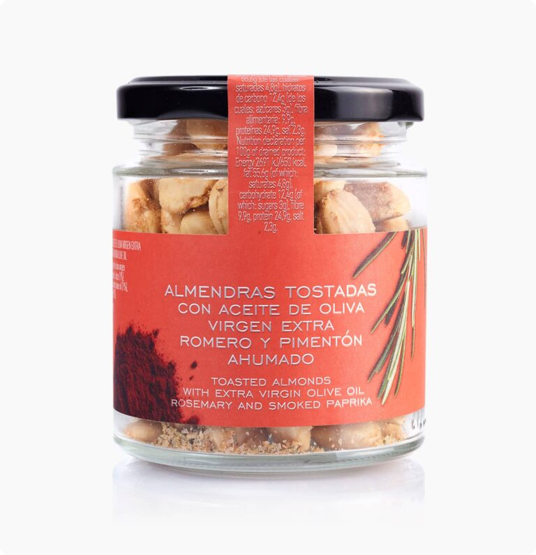 Pražené mandle s extra panenským olivovým olejom, rozmarínom a údenou paprikou La Chinata sú pestované ako špecifický druh „A la Marcona“, ktorý sa pestuje iba v Španielsku.